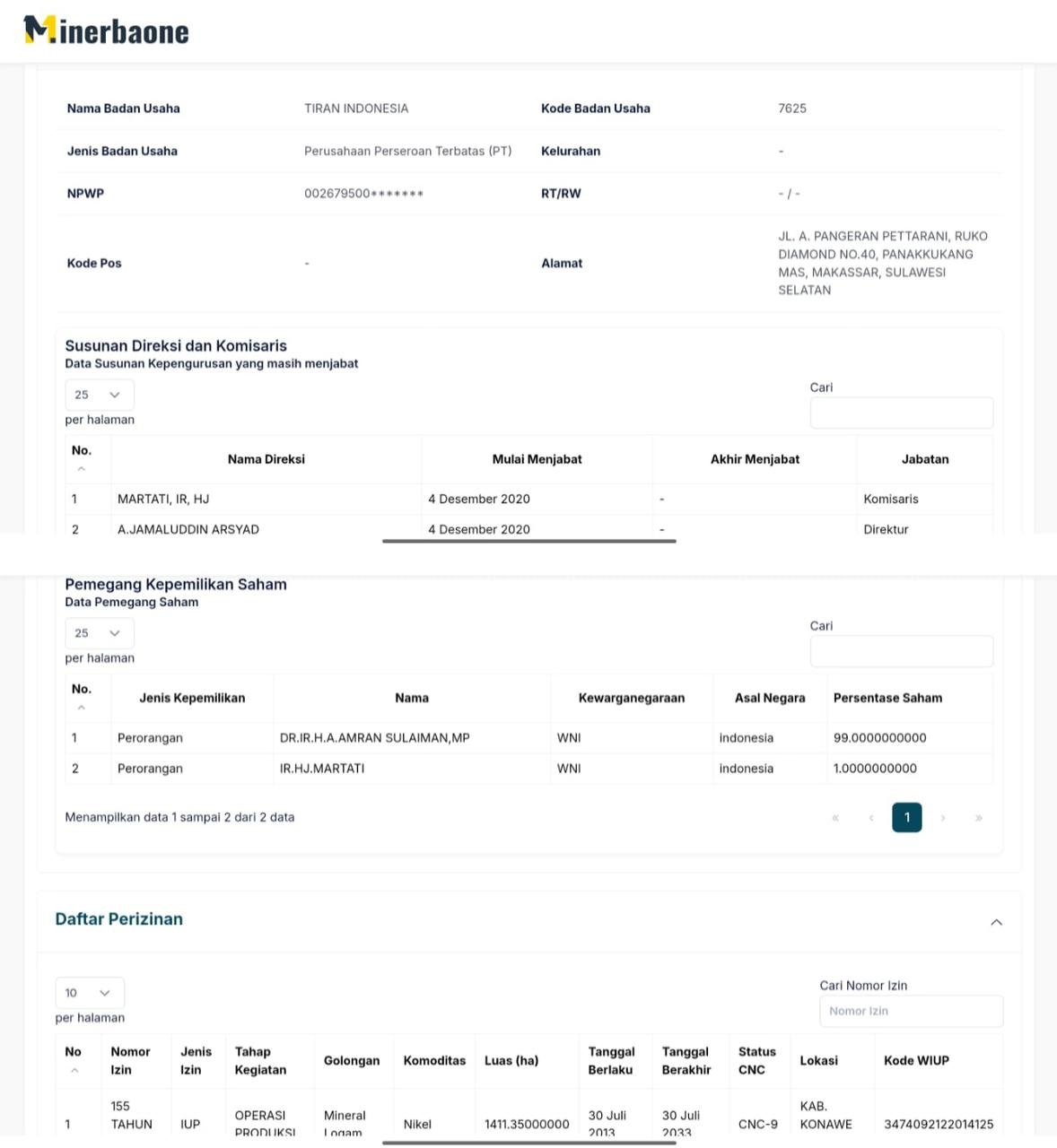 Dalam data tersebut, diketahui PT Tiran Indonesia beralamat di Jalan A Pengeran Pettarani Ruko Diamond No 40, Panakkukang, Makassar Sulawesi Selatan. Pada posisi struktur organisasi perusahaan PT Tiran Indonesia, Komisaris dijabat oleh Martati dan Direktur dijabat oleh A Jamaluddin Arsyad. Dalam data tersebut juga diketahui nomor izin PT Tiran Indoensia yakni 155 tahun 2013 dengan jenis izin adalah Izin Usaha Produksi (IUP) dengan golongan Mineral Logam, Komoditas Nikel.