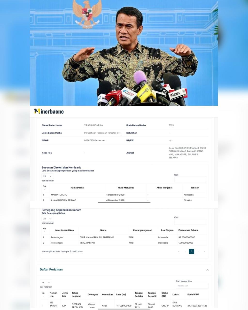 Dalam data tersebut, diketahui PT Tiran Indonesia beralamat di Jalan A Pengeran Pettarani Ruko Diamond No 40, Panakkukang, Makassar Sulawesi Selatan. Pada posisi struktur organisasi perusahaan PT Tiran Indonesia, Komisaris dijabat oleh Martati dan Direktur dijabat oleh A Jamaluddin Arsyad. Dalam data tersebut juga diketahui nomor izin PT Tiran Indoensia yakni 155 tahun 2013 dengan jenis izin adalah Izin Usaha Produksi (IUP) dengan golongan Mineral Logam, Komoditas Nikel.